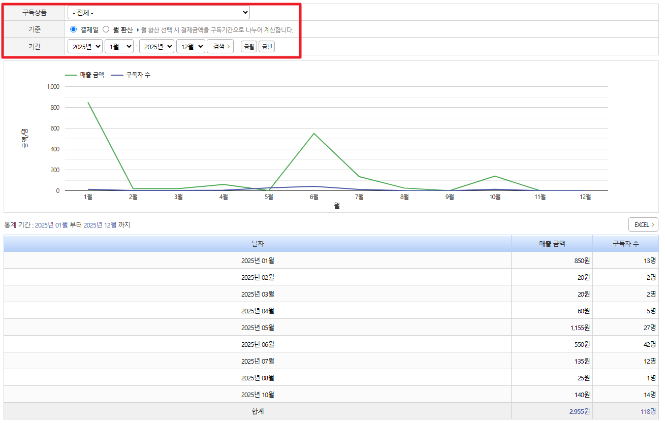 결제가 이루어진 월에 금액 및 구독자수가 집계되며,