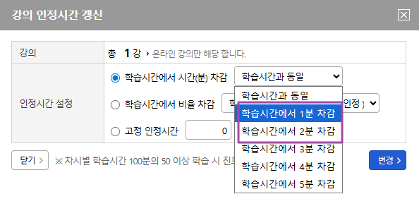 또한 수료를 위해서 학습시간 ( 강의시간)을 넣으신 후 인정시간은 90%이상으로 설정 또는 학습시간에서 1-2분 차감으로 설정해주세요
