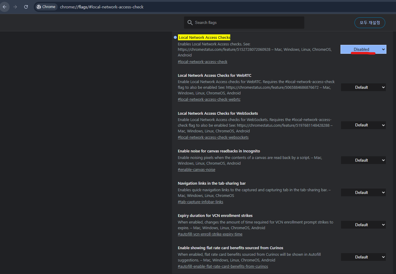 2. 노랑색 배경으로 보이는 Local Network Access Checks 항목의 Default를 마우스로 클릭하고 Disabled 로 변경해줍니다.