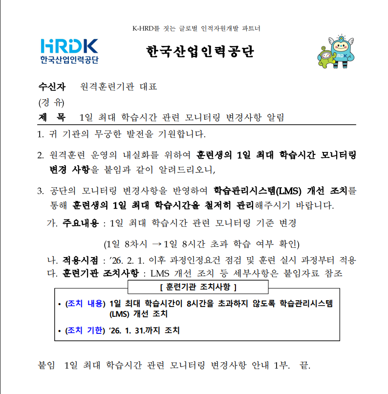 한국산업인력공단에서 원격훈련 운영의 내실화를 위해 훈련생의 1일 최대 학습시간 모니터링 기준을 개선하였습니다.
